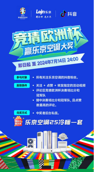 即日起至2024年7月14日24:00,樂京空調(diào)抖音官方賬號推出送禮活動——【樂京空調(diào)歐洲杯,競猜比分贏空調(diào)】,人人有機(jī)會領(lǐng)取價值不菲的樂京空調(diào)25冷暖一套!