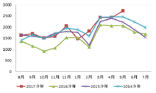 產(chǎn)業(yè)在線:2014-2017冷年空調(diào)電機(jī)內(nèi)銷(xiāo)走勢(shì)(萬(wàn)臺(tái))