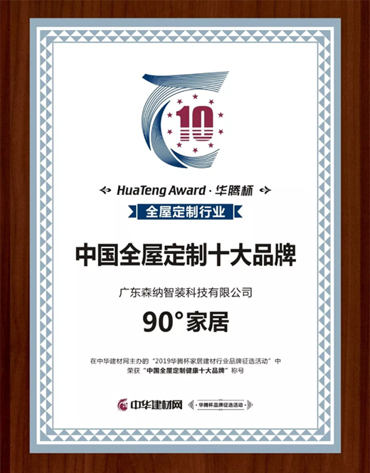 勢如破竹,榮譽加冕。近日,90°家居榮膺“中國全屋定制十大品牌”,品牌榮譽再翻新篇章,為品牌發(fā)展邁向新臺階、新征程提供強有力的保障。