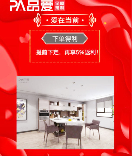 本次“愛在當(dāng)前”,品愛感謝客戶、粉絲的支持,贈送和返利高達(dá)1億6千萬元,讓“有家的地方就有品愛定制”,享受“品質(zhì)生活,由愛開始”。