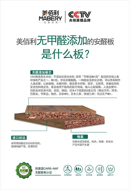 作為“中國十大全屋定制品牌”,美佰利憑借其核心技術(shù),從原材把控,到成品監(jiān)督一系列流程都實行嚴格管控,做到無醛無苯添加,為行業(yè)推出真正的無醛環(huán)保板材。未來,美佰利將繼續(xù)發(fā)揮行業(yè)標桿作用,不斷升級板材工藝、提高板材性能、突破環(huán)保壁壘,為的就是能夠滿足千萬家庭對健康家居生活的需求,而這就是美佰利“安醛板”誕生的初衷。