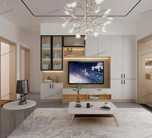 這款定制電視柜收納功能同樣十分強(qiáng)大,白色+木色和諧統(tǒng)一,完美銜接,玻璃柜門的插入使整個空間靈動了起來。