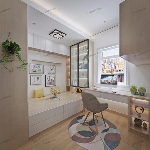 當(dāng)下剛需戶型中總會帶一個不大不小的房間,僅用作儲物房有點(diǎn)浪費(fèi),當(dāng)作兒童房有點(diǎn)壓抑,其實(shí)這樣的房間可以選擇定制,作為多功能房,可以當(dāng)做收納用,可以當(dāng)作書房,如果有客人來,可以當(dāng)做客房。要說收納小能手,第一時間想到的便是榻榻米,在榻榻米旁邊延伸做一個書桌,轉(zhuǎn)身一變成了書房。一個獨(dú)立的辦公、學(xué)習(xí)空間就妥妥的布置完畢啦!