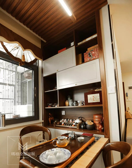 在客廳另一側(cè)凹陷位置,是為愛喝茶的父母打造的茶室。在靠墻的位置定制了頂天立地的茶柜,放置了一個(gè)小茶桌,平日里父母都喜歡坐著這里喝茶、聊聊天。