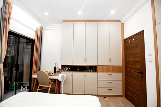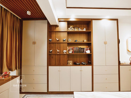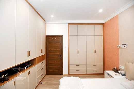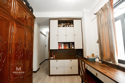 她考慮衣服比較多,定制衣柜要足夠大,能輕松所有的衣物。在門后連接書桌的是儲(chǔ)物柜,存放平日里看的書籍及包包等物品。