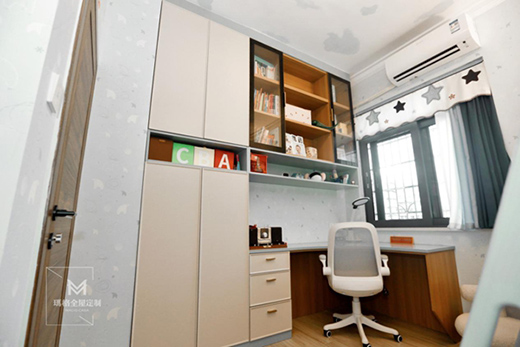 對于孩子的房間,除了滿足功能上的實(shí)用外,環(huán)保也是她重點(diǎn)考慮的地方,在墻面,衣柜的選擇,全部選用環(huán)保材料,后期也做了甲醛處理。弟弟的玩具及物品很多,除了大衣柜外,還定制了書桌柜來收納玩具,圖書等。
