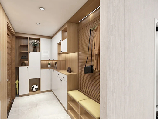 從大門進來,潔白的空間,在原始木質(zhì)與白色板材的融合下,呈現(xiàn)出靜雅端莊的玄關(guān),讓回家充滿儀式感。