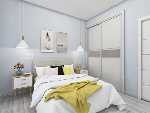 木質(zhì)斗柜搭配白色床單,藝術(shù)質(zhì)感的床頭掛畫,打造舒適俐落的休憩空間;結(jié)合嵌入式推拉門衣柜,讓空間收納更加實用方便。