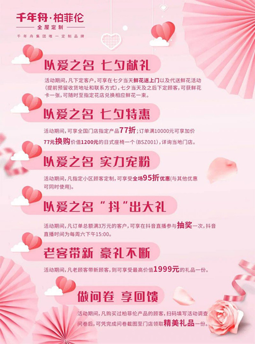 農(nóng)歷七月初七是中國(guó)傳統(tǒng)情人節(jié),感謝您一直以來對(duì)千年舟·柏菲倫全屋定制的支持與喜愛,特于2020年8月20日—2020年9月13日,在全國(guó)千年舟·柏菲倫全屋定制指定活動(dòng)門店舉辦此次“以愛之名,七夕‘價(jià)’給你”活動(dòng)。
