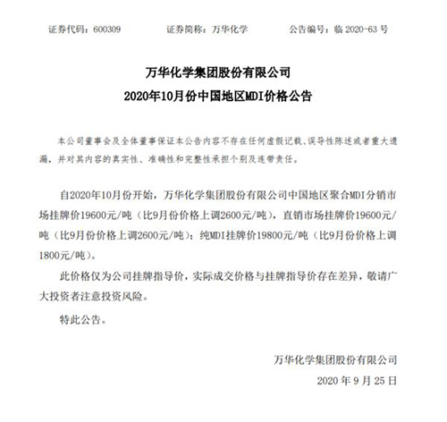 9月24日,國內(nèi)化工龍頭萬華化學公告宣稱,自2020年10月份開始,公司中國地區(qū)聚合MDI掛牌價19600元/噸,比9月份價格上調(diào)2600元/噸,單月暴漲15%。