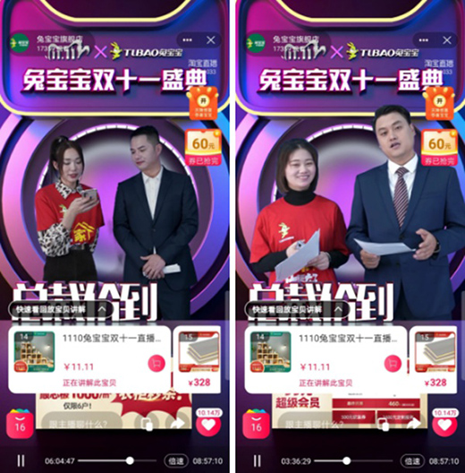 隨著直播經(jīng)濟(jì)的大爆發(fā),2020年兔寶寶雙十一活動(dòng)也加入了直播,這也是本次活動(dòng)的最大亮點(diǎn)。其中,最令人激動(dòng)的是“總裁價(jià)到”環(huán)節(jié),德華兔寶寶裝飾材料銷(xiāo)售有限公司總經(jīng)理趙建鋒、德華兔寶寶家居公司總經(jīng)理沈怡強(qiáng)兩位領(lǐng)導(dǎo)走進(jìn)直播間,對(duì)兔寶寶品牌和產(chǎn)品進(jìn)行詳細(xì)講解,兔寶寶綠色環(huán)保的家居裝飾產(chǎn)品深入人心,此外,兩位總裁還給觀眾帶來(lái)十足的福利,直播間人氣也是一浪高過(guò)一浪,一度突破高點(diǎn)。在流量資源至上的線上市場(chǎng),兔寶寶用行動(dòng)打贏了最旺節(jié)點(diǎn)。