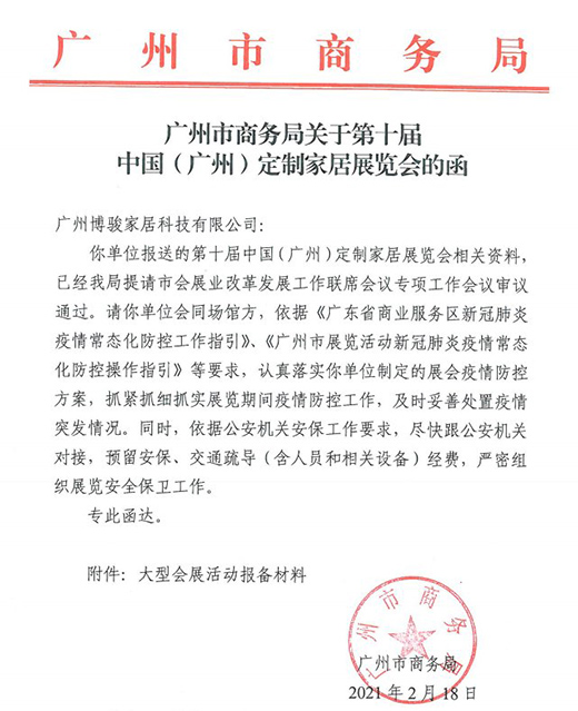 作為國(guó)內(nèi)定制家居第一展,廣州定制家居展自然也不甘落后。在各級(jí)政府部門的大力支持下,在業(yè)界同仁的殷切期盼下,第十屆中國(guó)廣州定制家居展終于也在2月18日迎來(lái)了廣州市商務(wù)局的正式批文,辦展申請(qǐng)獲得官方審議通過(guò)。