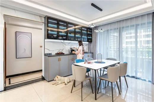 考慮多數(shù)屋主會選擇把公共空間的收納重任交給餐廳,對此聯(lián)邦高登高端全屋定制特別設(shè)計了頂天立地的多功能餐邊柜,這種柜體足以高效應(yīng)對餐廳的使用和收納需求,黑框玻璃柜門神秘不張揚,內(nèi)設(shè)燈帶展示感十足。多樣化延展餐邊柜功能,從上至下分成通透展示區(qū)、開放式簡餐臺、封閉式收納三大區(qū)域,充分滿足男女主人各自的日常使用要求。展示頂柜可以擺放主人珍藏的各類珍品、茶具,中部備餐臺可放置小型家電設(shè)備,底部則是封閉儲物區(qū),可以將日用品整齊儲藏。
