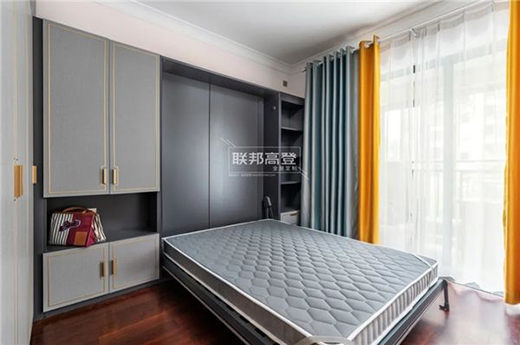 針對次臥空間的設(shè)計,以收納置物功能為主,額外可以兼職“客房”使用,實現(xiàn)多功能用途。定制柜選用淺卡其布卡斯系列,搭配太空灰柜體顯得靜謐又養(yǎng)眼。定制柜內(nèi)特意設(shè)置了下翻床設(shè)計,以備有客人到訪需要留宿的不時之需。輕便下翻床,即便是一人操作也能輕松勝任。當下翻床收起來之后,留出的區(qū)域也可以打造成為健身休閑區(qū)或是小寵物們的活動區(qū),用途功能豐富多變。