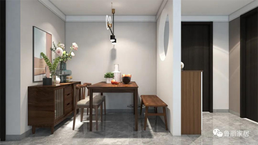 木紋質(zhì)感的餐邊柜可以盡情收納,增加抽屜設計可以方便物品的日常取放,百葉造型的柜門與空間整體格調(diào)和諧一致,不同造型的餐椅與吊燈形成一種和諧美,加上光的穿透力,讓這小小的空間也變得典雅時尚。