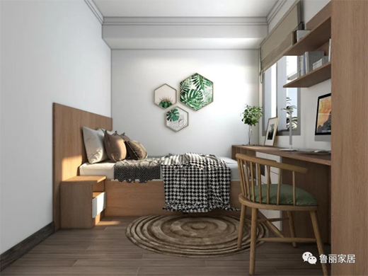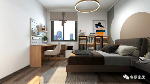 臥室雖小,但魯麗家居的定制設計還是將空間的利用做到了最大化。轉(zhuǎn)角書桌充分利用拐角區(qū)域,與書柜相結(jié)合在臥室中打造出一片學習的小天地。