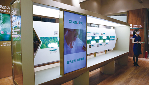“綠色”一直是全友所堅(jiān)守的品牌價(jià)值與發(fā)展理念,本次成都家具展中,全友的展廳亦是圍繞著這一核心理念進(jìn)行設(shè)計(jì),打造了以“翠心林隙”為主題的綠色展廳。在外觀上,展廳融合竹林意象,以高大、豎直的線條構(gòu)成。步入其中,左右兩側(cè)分別是產(chǎn)品展示區(qū)以及洽談區(qū),而中心位置設(shè)立成為企業(yè)文化展示區(qū),通過多媒體交互及文化墻展示,全方位向來(lái)訪者傳達(dá)著全友的“綠色”企業(yè)文化。