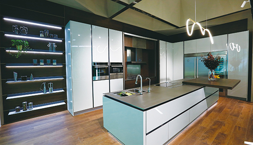 在廚房空間,除了“多功能墻面家居”的應(yīng)用外,還在櫥柜內(nèi)植入了電動(dòng)抽屜、智能燈光系統(tǒng)、電動(dòng)水晶宮等智能AI系統(tǒng),最大化實(shí)現(xiàn)廚房科技化和智能化。
