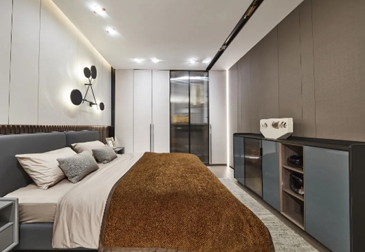 臥室利用超高門衣柜拉升視覺,采用異色封邊工藝的橫濱白雙飾板,科技橫紋層層交疊,肌理感與立體感十足,強(qiáng)烈的線條感凸顯出極簡美,整體柜身輕薄而穩(wěn)定。衣柜的灰白色調(diào)營造出舒適輕盈之感,搭配紋路細(xì)膩的磨砂玻璃,新奇而質(zhì)樸,朦朧而寫意。素雅恬淡、具有超薄框架結(jié)構(gòu)的斗柜,增加了空間的層次感,更方便收納使用頻率較高的物品。整個(gè)空間搭配隨意而時(shí)尚的燈具,恬淡的生活氣息自然流露。