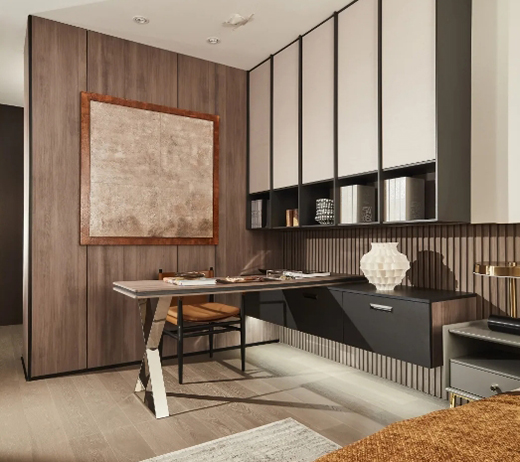 兼具收納、裝飾功能的書柜,利用開放格與封閉柜組合,增強(qiáng)了書房的層次感,為讀書時(shí)營造出靜謐的氛圍,造型簡約的書桌與收納柜連接成一體,表現(xiàn)出空間獨(dú)特的美感,可謂匠心獨(dú)運(yùn)。簡約的復(fù)古地毯與書桌后的木紋背板相互呼應(yīng),把古典和雅致融合統(tǒng)一。