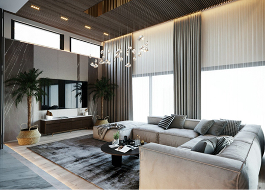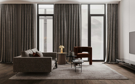 暗色的地毯和天花板相互呼應(yīng),讓家空間更加沉靜安穩(wěn)。