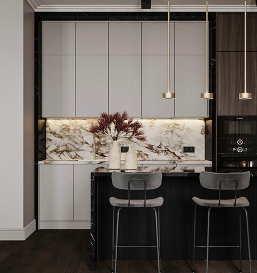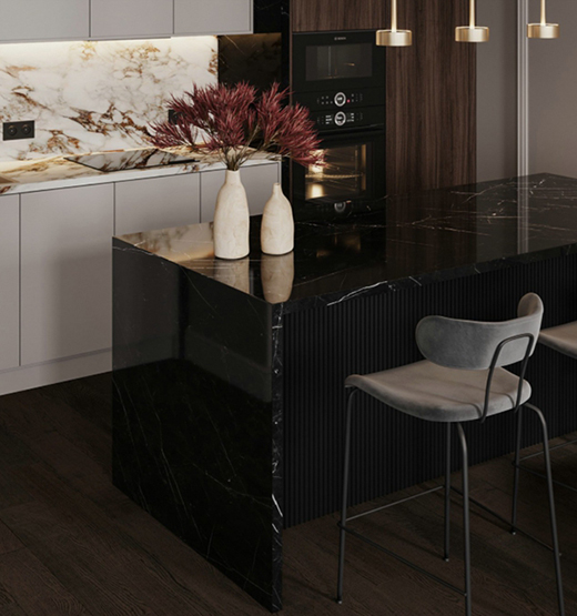 白色的大理石紋,勾勒出黑色餐臺的肌理。