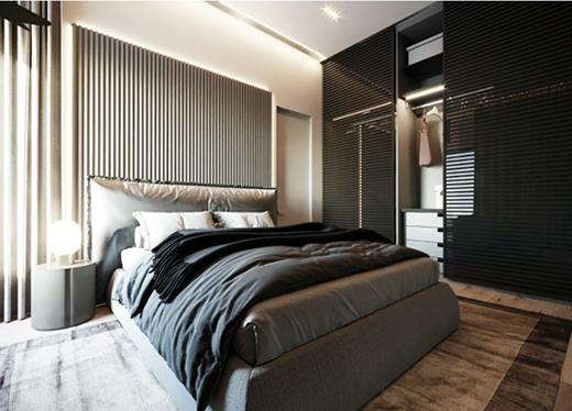衣帽間的格柵與床背景的條紋相互呼應(yīng),橫向抑或縱向,讓視線延伸。