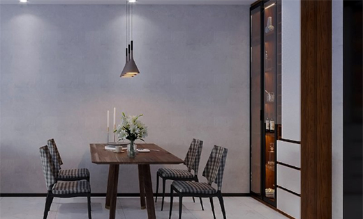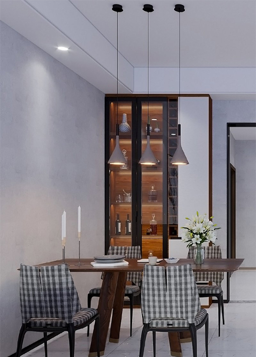 玻璃掩門置放收藏,封閉柜門收納雜亂,三兩吊燈垂引出生活百味。