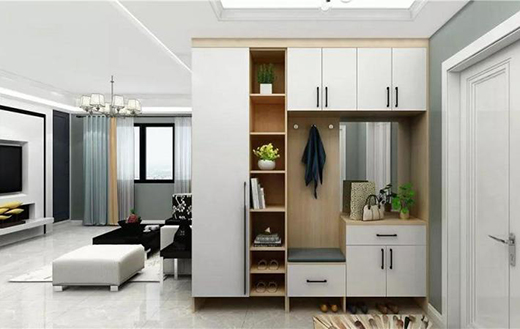 從進(jìn)門開始看,玄關(guān)柜幾乎是現(xiàn)在的家庭標(biāo)配,它可以起到劃分空間,裝飾儲物的功能,這里也是我們出門進(jìn)門的第一空間,因此玄關(guān)柜的重要性跟合理性就不言而喻。全屋定制中的玄關(guān)柜經(jīng)常會和鞋柜融為一體,上下分區(qū)明確,上部是雨傘包包等收納區(qū),下部是集成鞋柜,一般底層還會留空,以便日常換鞋。