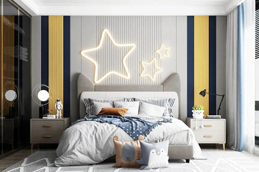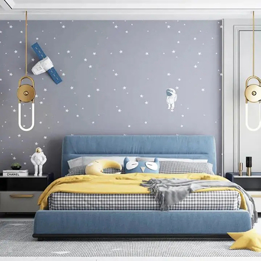 兒童房墻面記得一定不要裝修的太花哨,過于艷麗的顏色會讓孩子的情緒更為浮躁。所以兒童房的墻面在配色的時候,要充分根據(jù)孩子的視角,掌握適當(dāng)?shù)某潭葮?biāo)準(zhǔn)。