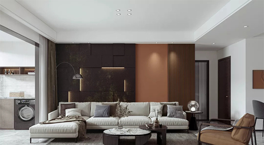 輕奢工業(yè)常以黑、白、灰等冷色系為主,加入1-2種暖色調(diào)家具,如布料米色沙發(fā)、橘色休閑椅,增加空間溫度,銹蝕鋼板做背景墻,與墻面的橘色相呼應(yīng),為空間創(chuàng)造微溫馨俏皮的視覺效果。