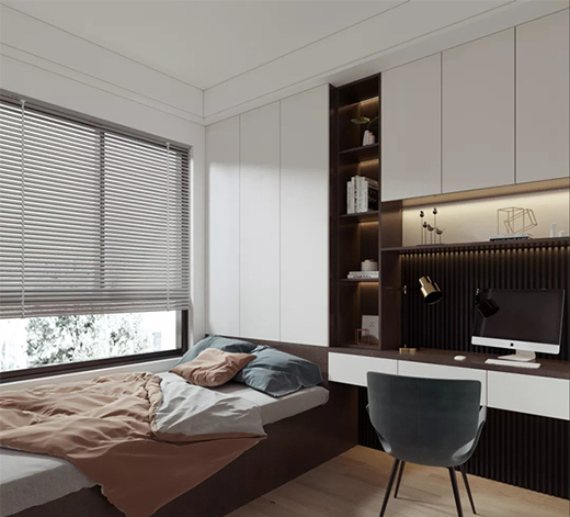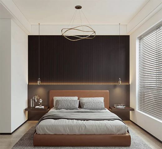 阿爾卑斯白的置頂衣柜,電視柜、梳妝臺(tái)一體化的設(shè)計(jì),滿足多樣的收納需求,收納力MAX,擴(kuò)大人在臥室自由活動(dòng)的區(qū)域。棕色格柵背景墻,略帶金屬小細(xì)節(jié),簡(jiǎn)而不失其華,奢不顯其澀,回歸最根本的居住本質(zhì)。