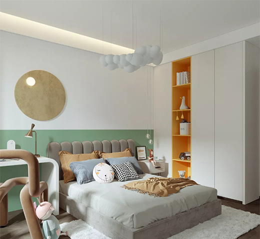 采用白色為主基調(diào),阿爾卑斯白的置頂衣柜,通過棕、橘等跳色增強(qiáng)視覺效果,書柜與學(xué)習(xí)桌結(jié)合,加以燈光營(yíng)造的視覺效果,給孩子更多的趣味和想象。