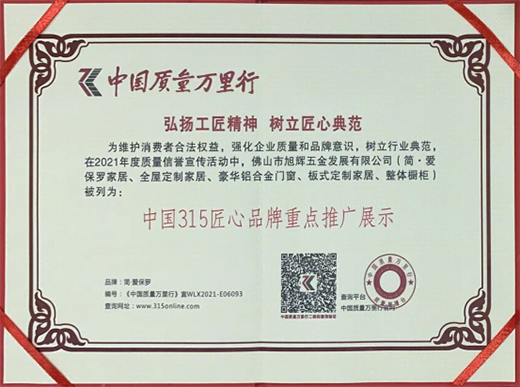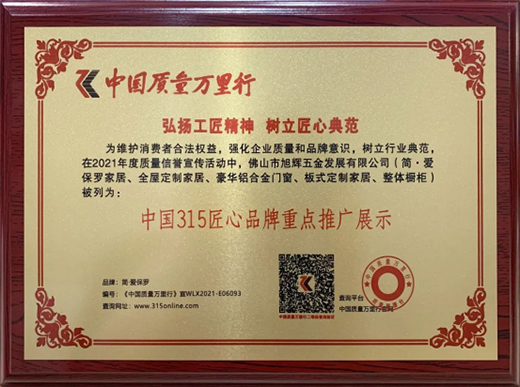 為維護(hù)消費(fèi)者合法權(quán)益,強(qiáng)化企業(yè)質(zhì)量和品牌意識(shí),樹(shù)立行業(yè)典范,在2021年度質(zhì)量信譽(yù)宣傳活動(dòng)中,佛山市旭輝五金發(fā)展有限公司(簡(jiǎn)·愛(ài)保羅家居、全屋定制家居、豪華鋁合金門(mén)窗、板式定制家居、整體櫥柜)被列為:中國(guó)315匠心品牌重點(diǎn)推廣展示。
