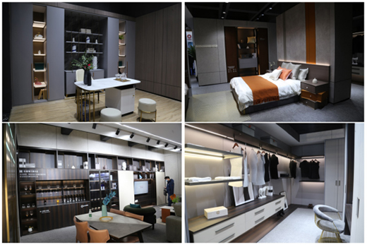 在展館內(nèi)部,展示了簡鉆旗下的“輕奢至臻”系列,采用進口板式與當今潮流色互相搭配,釋放詩意與浪漫的空間。柜體運用結(jié)構(gòu)感強烈的墻面設(shè)計,凸顯極簡美感,探尋無拘束生活潛能。