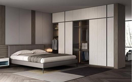 臥室衣柜則是采用膚啞門板,觸摸起來感覺細(xì)膩,放眼則極具有視覺享受,讓人內(nèi)心恬淡,整個臥室都充滿靜謐情調(diào),營造一個優(yōu)質(zhì)睡眠環(huán)境。