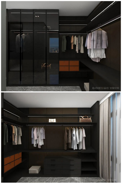 深色系的整體色調(diào),加之橘調(diào)的點綴,整個空間莊重又不顯沉悶,開閉式結(jié)合,極大限度地滿足收納陳列需求。
