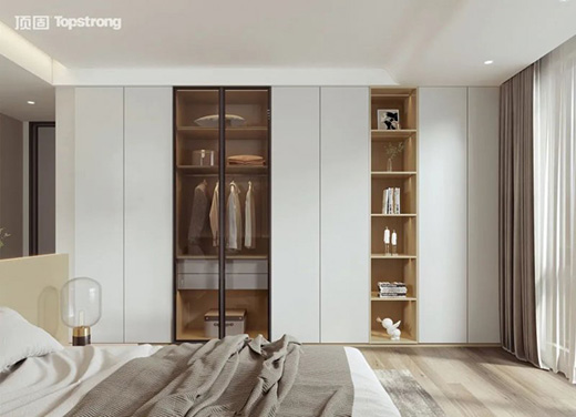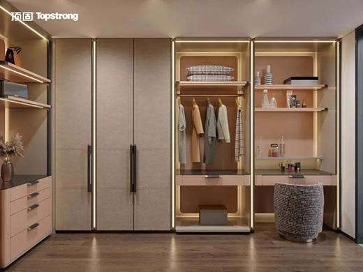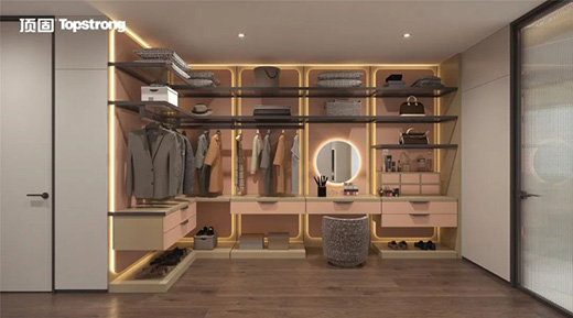 云夢紅懸浮背板嵌于開放式衣柜中,當光影透過,徜徉于深淺交織的色彩當中,讓原本單調(diào)的生活更顯生機。