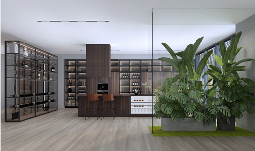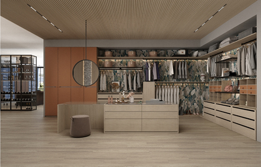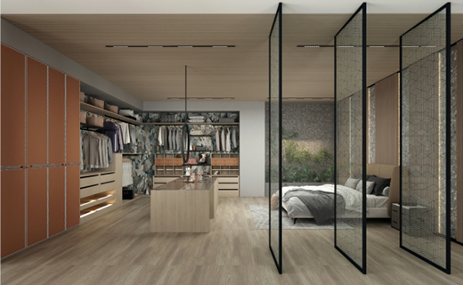錯落有致的鏤空收納設(shè)計,搭配透光玻璃隔斷,將現(xiàn)代審美與藝術(shù)韻致完美糅合。滿是“綠意”的植物背景墻從地板延伸至天花板,將自然與家相接,衣物猶如置身“垂直森林”,生機(jī)煥發(fā),只為取悅即將盛裝出行的你。