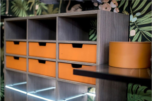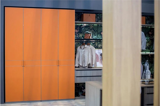 灰色維琴察橡木與熱帶橙皮革浪漫邂逅,詮釋空間奢感。灰色維琴察橡木表面啞光的質(zhì)感,又輔以細(xì)膩的小木紋紋理,流暢而優(yōu)雅。熱帶橙皮革門板與進(jìn)口愛格柜體板完美匹配,一門到頂?shù)脑O(shè)計塑造空間張力。