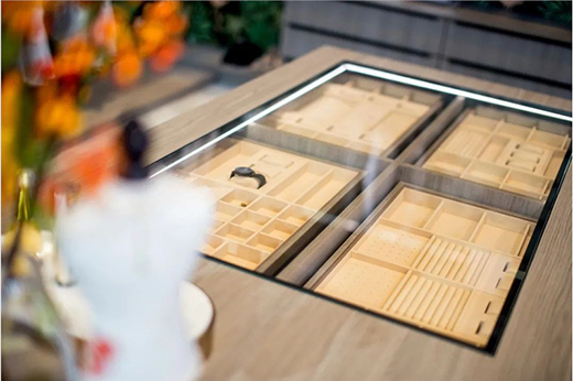 層次和可變性,創(chuàng)造出空間的多樣可能性,以通透的玻璃陳列架為界,無形區(qū)分空間功能,向左是每一餐人間煙火,向右是每一日閑適生活。一道道美味,承載了人生百味,也流轉(zhuǎn)著四季繽紛的精彩。