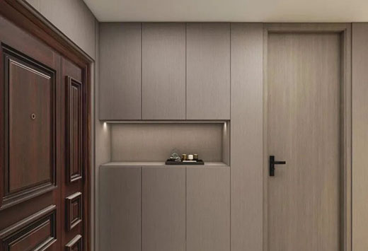 入戶空間做鞋柜內(nèi)嵌,釋放走廊空間,底部懸空設(shè)計(jì),內(nèi)嵌感應(yīng)燈帶,深夜回家不用再摸黑,中間鏤空便于隨手?jǐn)[放小物件,在一定程度上減少柜體帶來(lái)的壓抑感,也讓入戶更通透。