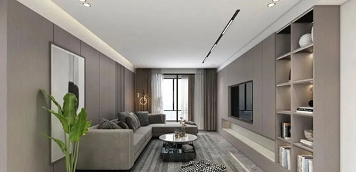 客廳整體采用灰色系空間,整墻電視背景收納柜與沙發(fā)護(hù)墻板呼應(yīng),搭配極簡(jiǎn)風(fēng)的沙發(fā)與地毯,布局簡(jiǎn)單且處處充滿高級(jí)質(zhì)感!