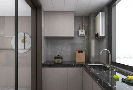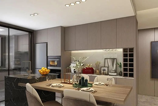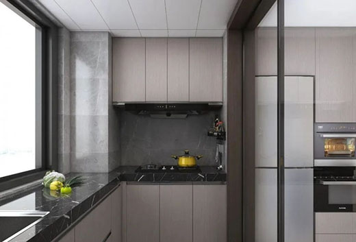 餐廳與廚房一體化設(shè)計(jì)半開(kāi)式格局,與餐廳結(jié)合增加家人互動(dòng)性,U型櫥柜增加了廚房的儲(chǔ)物空間,美觀性與實(shí)用性兼具。