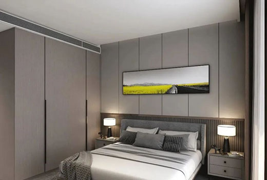 臥室延續(xù)整體空間色調(diào),高級(jí)灰色系打造低調(diào)有內(nèi)涵的舒適空間,一門(mén)到頂?shù)囊鹿翊钆浜诮鹄指@高級(jí)。