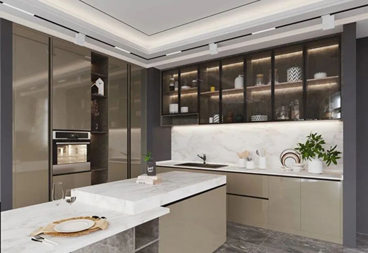 讓人眼前一亮的廚房,明亮寬敞,舒適大方,桌面采用優(yōu)雅的白色,門板采用棕色,既溫馨又活潑。玻璃的設(shè)計,增加空間的通透感,不打開櫥柜門里面的物品。