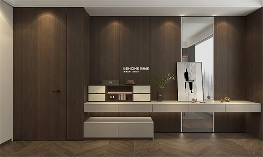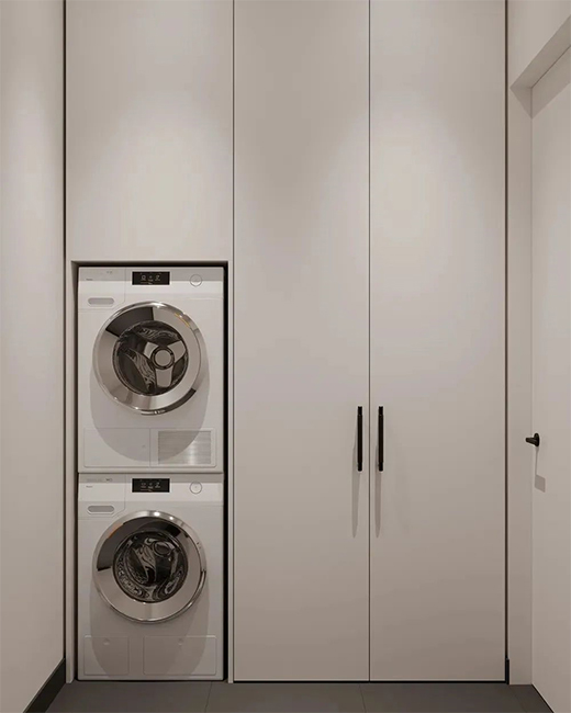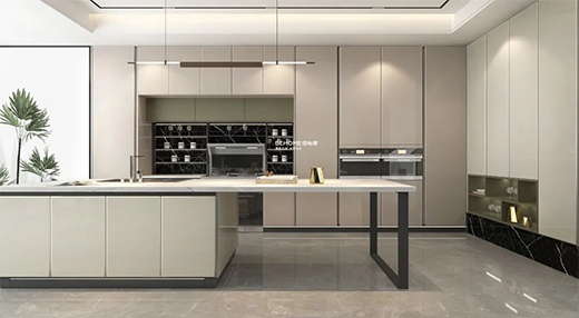 隱形設(shè)計。隱形設(shè)計能加強(qiáng)室內(nèi)平面上的平整度,在視覺上起到簡潔利落觀感。作為隱形設(shè)計的一種,無拉手設(shè)計用按壓反彈器取代傳統(tǒng)拉手,不會破壞背景墻的整體造型,使用上也更為方便。
