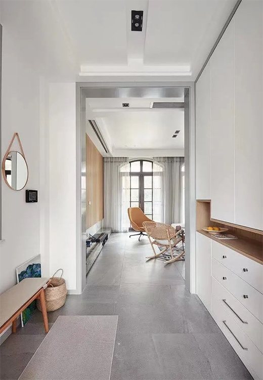 隱形門設(shè)計也是近年趨勢。門墻柜一體設(shè)計,同色同質(zhì),空間整體性更強(qiáng),空間延伸性更廣,加之極簡的設(shè)計,不用過分裝飾就能展示空間原本的美感。