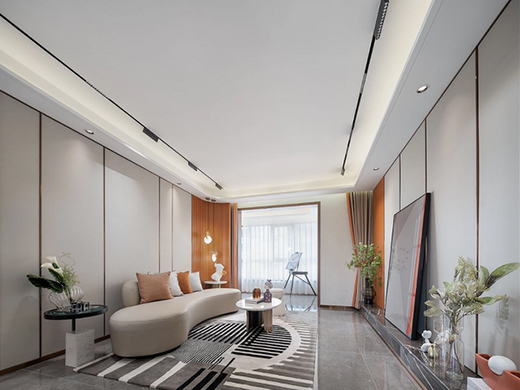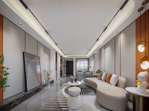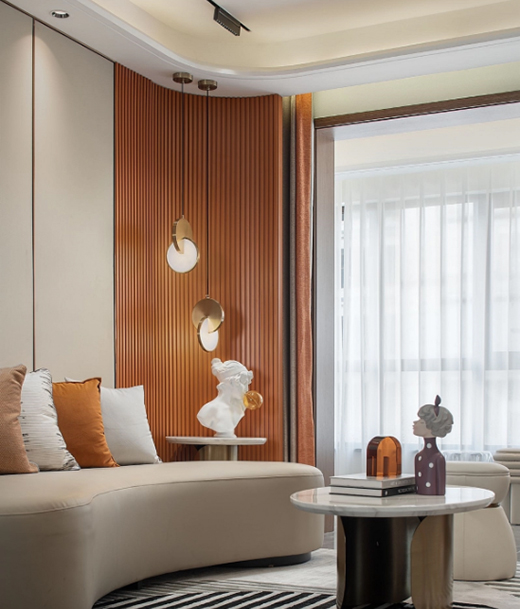 沙發(fā)上搭配幾個暖色系抱枕點綴,兩個茶幾上的藝術(shù)品,增加了看空間的藝術(shù)美感??看霸O(shè)計圓弧型橙色格柵護墻板,藝術(shù)吊燈的設(shè)計,既裝飾了空間設(shè)計感,同時又到了照明的作用。