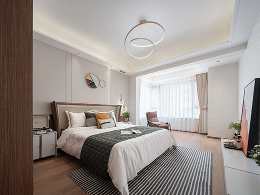 在軟裝細節(jié)上,通過暖色進行點綴。黑白條紋的地毯,高級又是時尚。墻面裝飾護墻板嵌入燈帶,增加臥室光源。藝術(shù)吊燈與掛畫的設(shè)計,裝飾出新穎感。窗簾設(shè)計通過少量的橙色進行點綴,與客廳設(shè)計相呼應(yīng)。